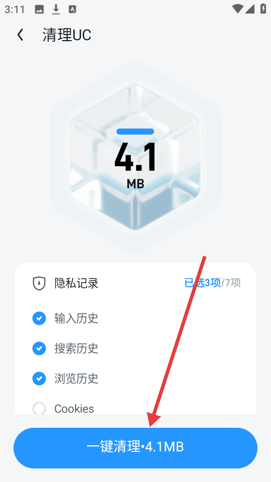 4、进入清理UC页面后,能看到可清理的内容,点击【一键清理·4.1MB】,就能快速清理掉这些数据啦。