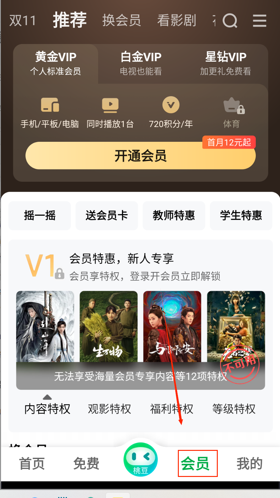 3、积分体系可以兑换权益,比如年度会员送的720积分能换观影券,在"会员"页面查看积分明细合理使用啦。
