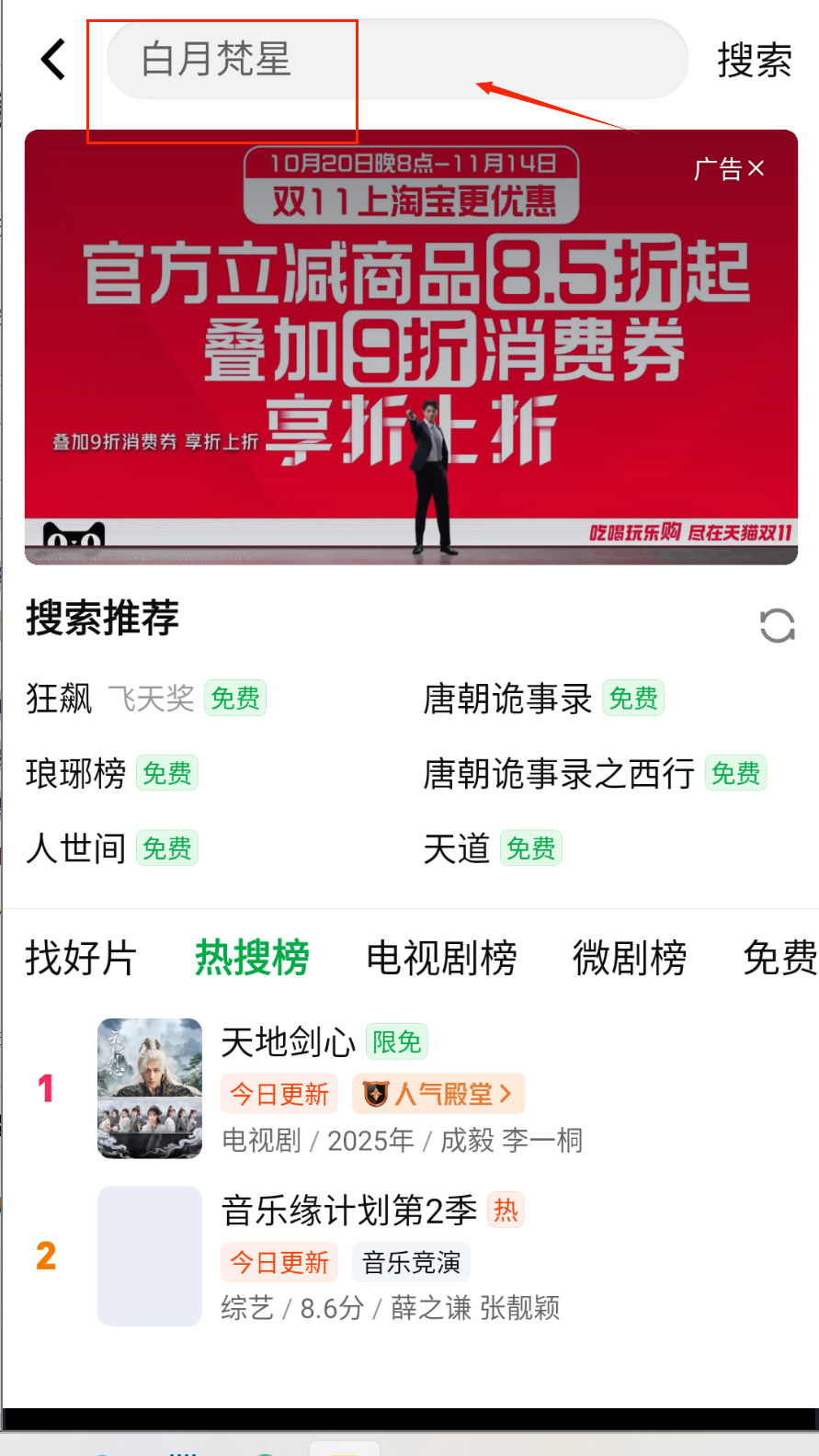 1、首页"推荐"板块会根据浏览习惯推送内容,比如双11活动专题或新剧《天地剑心》,多点赞收藏能让推荐更精准哟。