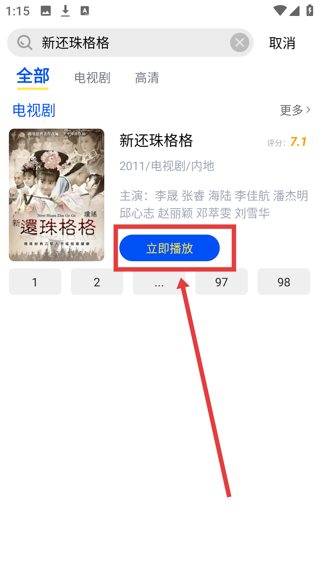 3、搜索后点击【立即播放】按钮,可进入剧集播放页面哦。