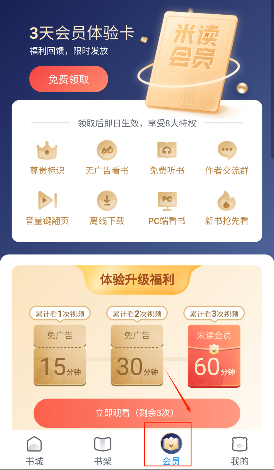 1、在会员页面可以领取3天免费体验卡,享受无广告阅读和专属特权,体验期内多看视频还能延长会员时长。