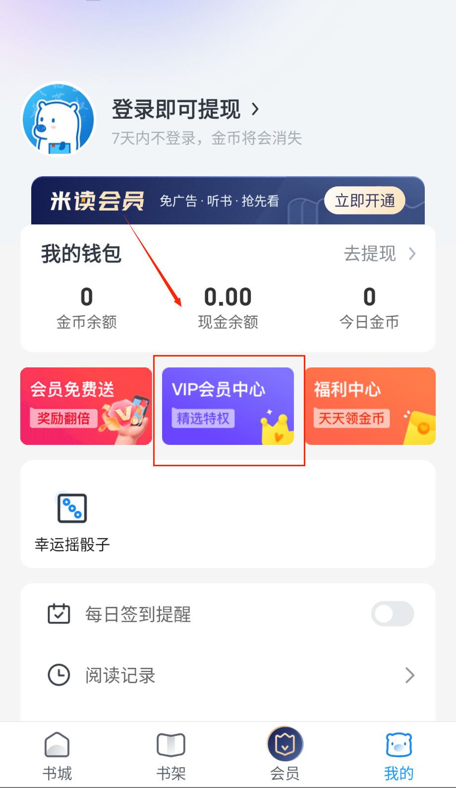 1、米读小说极速版中用户可以看到自己的阅读情况,需要点击软件“我的”页面后,选择阅读记录。