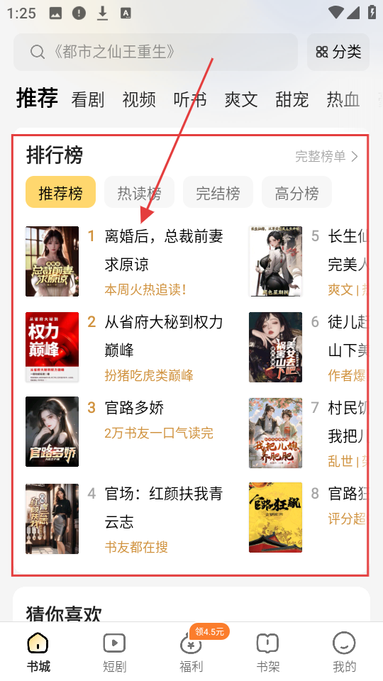 1、打开APP,在书城推荐榜选中心仪小说,比如【离婚后,总裁前妻求原谅】,进入阅读页啦。
