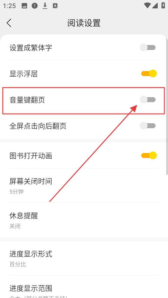 4、在阅读设置页面,可开启【音量键翻页】等功能,让阅读操作更便捷,提升阅读体验啦。