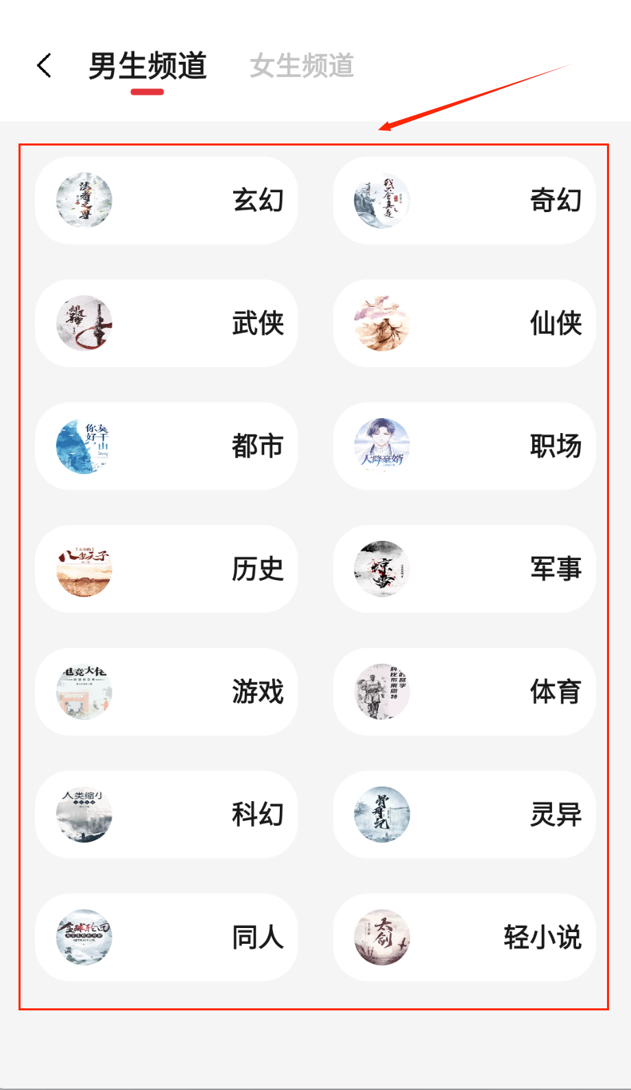 2、在书城页面选择频道后会出现分类图标,包括言情、玄幻等类型,点击图标就能进入书单页面啦。