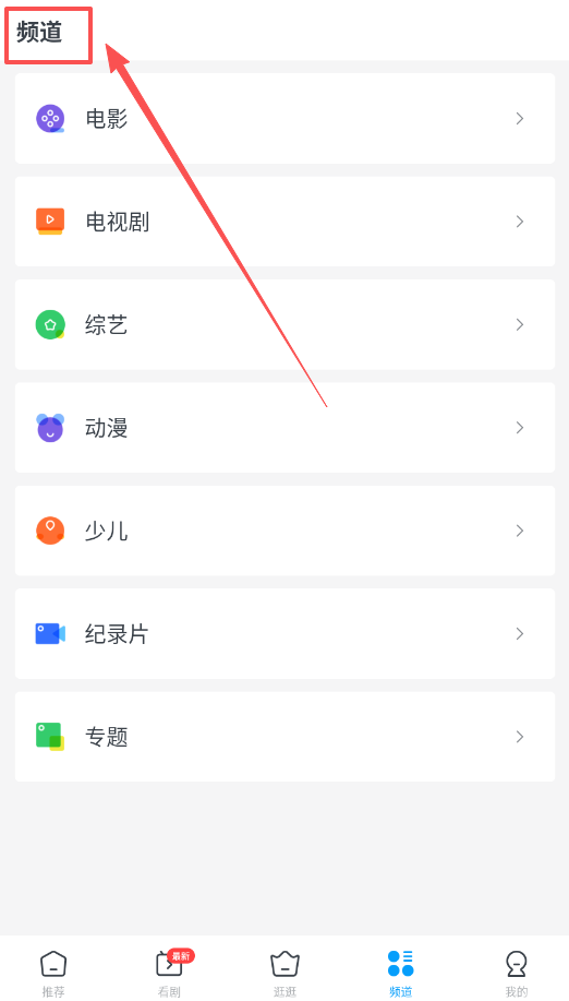 4、最后别忘了“频道”页,想看电影、动漫或者纪录片,去那里直接找对应的频道就行了,特别方便。