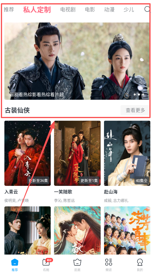 2、首页“推荐”板块是为你量身定制的内容,集合了热播剧、电影和动漫,直接点击就能观看。