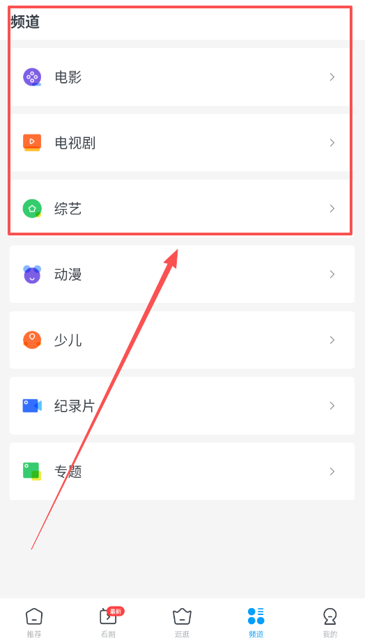 4、想快速找到特定类型内容,请使用底部“频道”功能,电影、综艺、纪录片等分类清晰,方便你精准筛选。