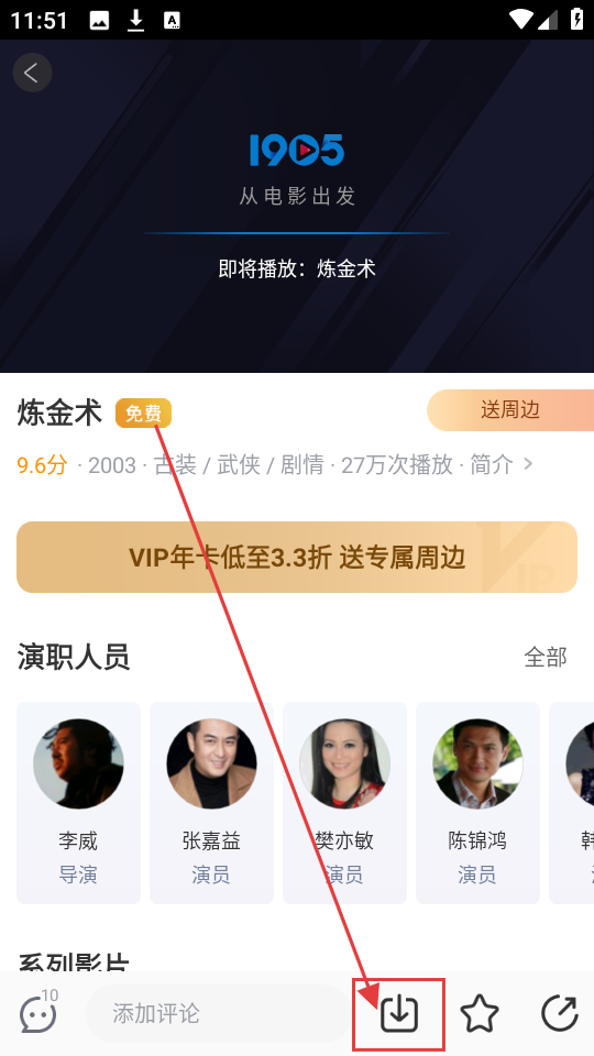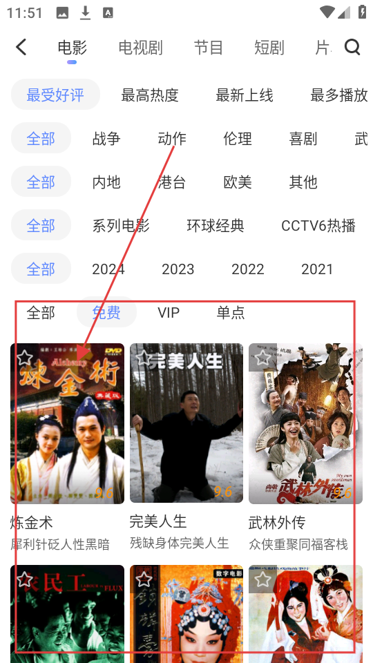 1、我们打开1905电影网APP,在电影分类下,选择免费类电影,比如《炼金术》,点击它就能进入影片详情页面啦。