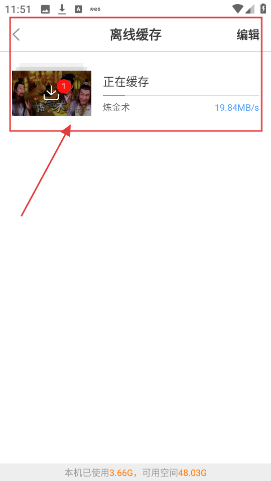 4、选择好画质开始下载后,进入离线缓存页面,就能看到《炼金术》正在缓存的状态啦,等待缓存完成即可。