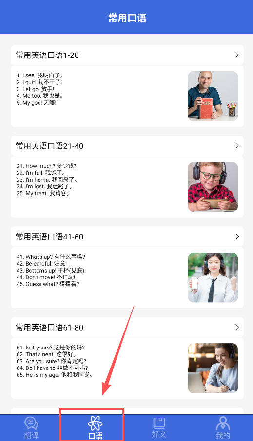 2、当你需要准备日常对话或者旅行用语时,就去口语库看看,它按场景分类好了句子,方便跟读记忆。