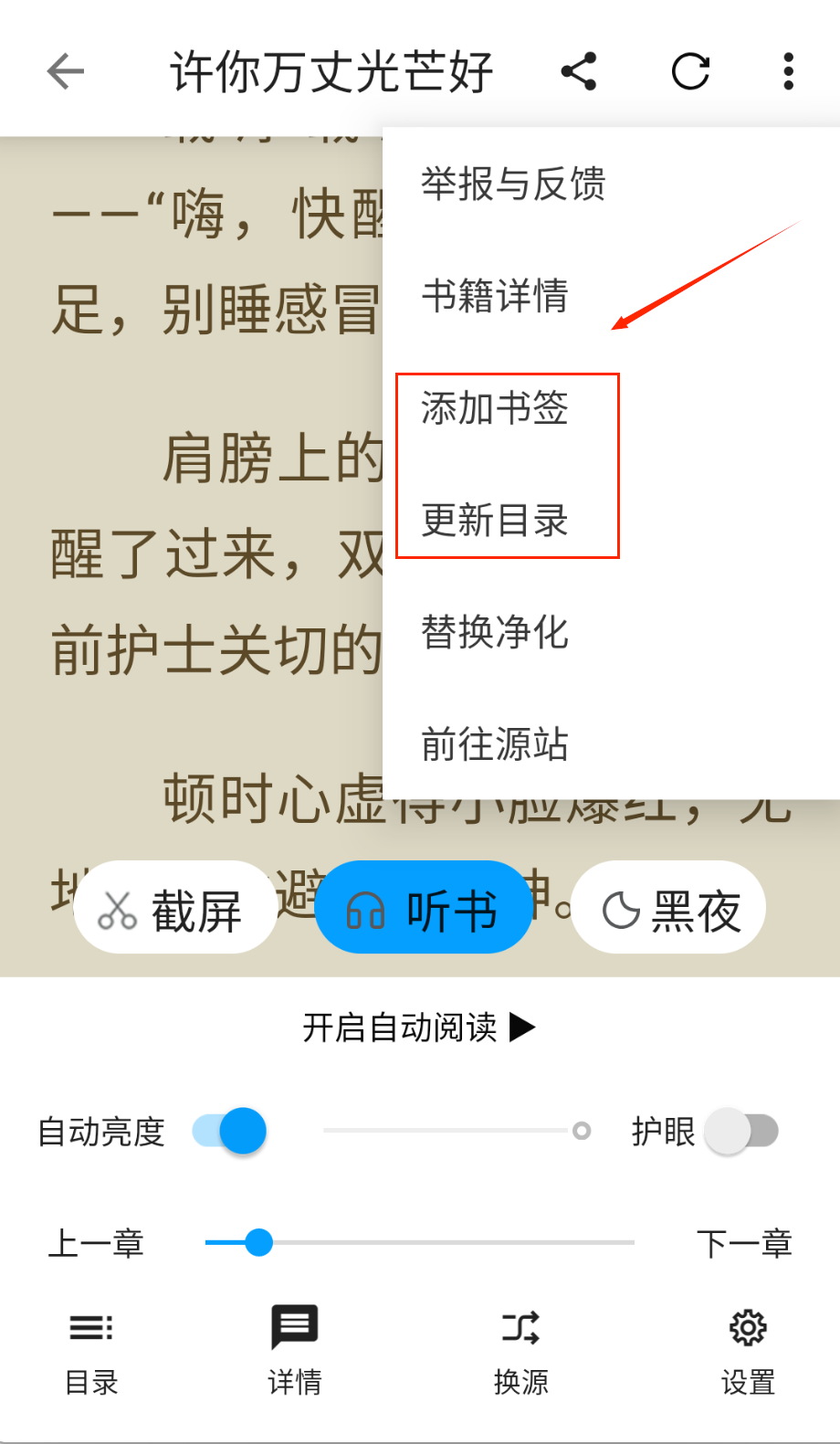 2、追更连载作品时,“更新目录”按钮能帮你快速获取最新章节,利用“添加书签”功能标记阅读进度,下次打开便可无缝续读了呢。