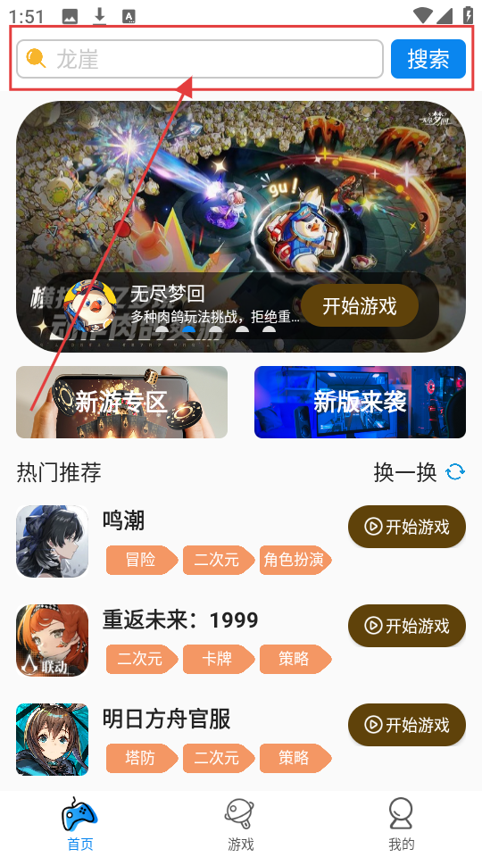 1、在首页点击上方搜索框,就能查找游戏啦。