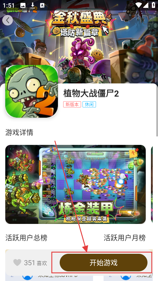 4、进入游戏详情页后,点击【开始游戏】,就能开始玩《植物大战僵尸2》啦。