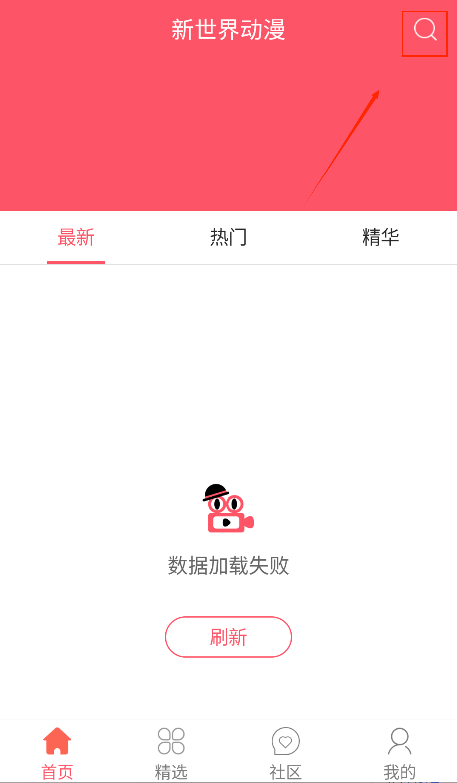 1、打开新世界动漫APP后首先会看到醒目的红色顶部横幅,中央显示"新世界动漫"名称,右上角有搜索图标。