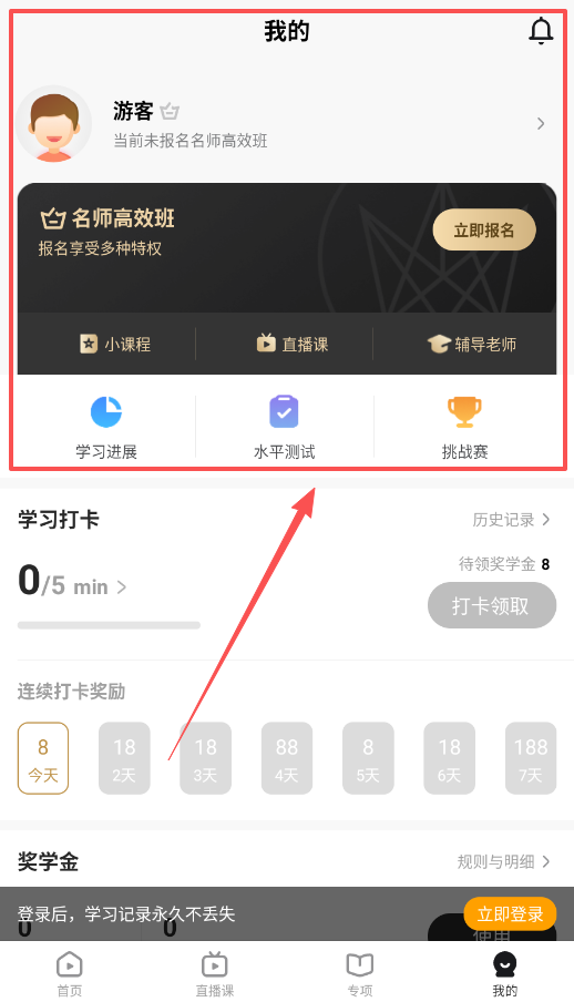 4、最后呢,记得点开“我的”页面查看个人学习情况。这里会显示你的学习进展和打卡奖励,坚持每日打卡能获得奖学金哦。