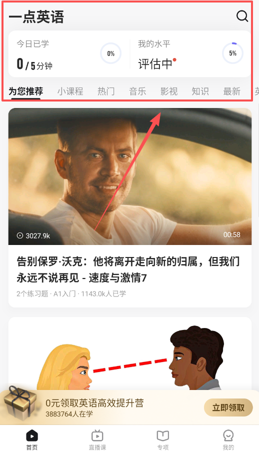 1、首先啊,打开 app 进入首页,你可以先看看“今日已学”的进度提醒,这里会显示你的学习时长目标。