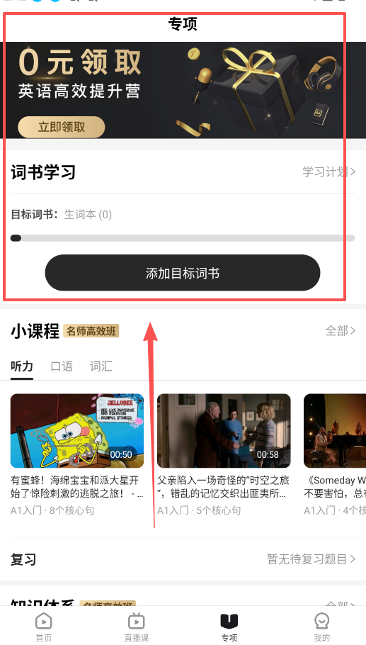 3、然后啊,别忘了“专项”练习这个板块。在这里你可以找到针对听力、口语、词汇的专门练习,还能设定自己的词书学习计划。