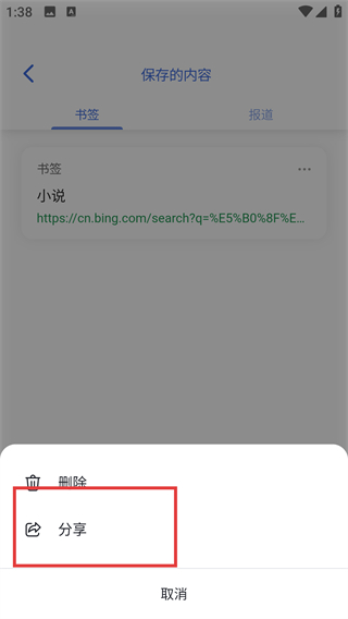 4、在弹出的菜单里选择【分享】选项,就能把这个书签内容分享给其他人啦,是不是很实用呀。