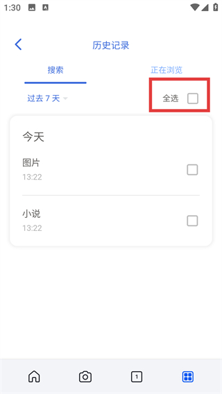 2、进入历史记录页面后,点击右上角【全选】按钮,就能一次性选中所有的历史记录内容哦。