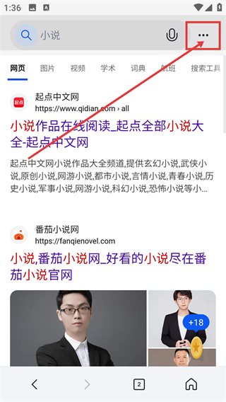 2、搜索结果页点右上角的三点图标,能弹出操作菜单,后续可进行书签保存等操作哦。