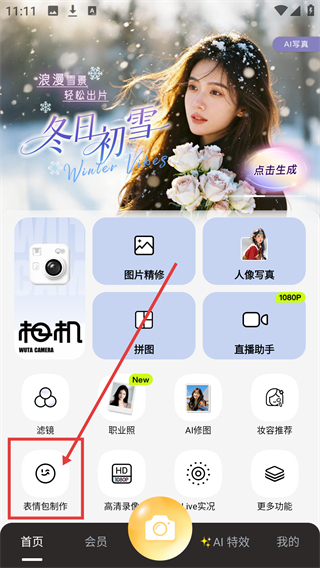 1、进入主页后,找到【表情包制作】功能并点击,就能进入表情包的创作界面啦。