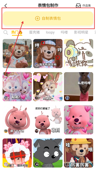 2、在表情包页面点击【自制表情包】按钮,就能开始创建专属的表情包内容哦。