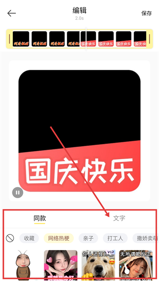 3、进入编辑页后,切换到【文字】标签,就能选择不同分类的文案素材来搭配表情包啦。