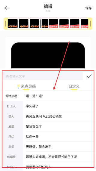 4、在文字素材里选择喜欢的文案,比如【网络热梗】类的内容,就能快速添加到表情包里哦。
