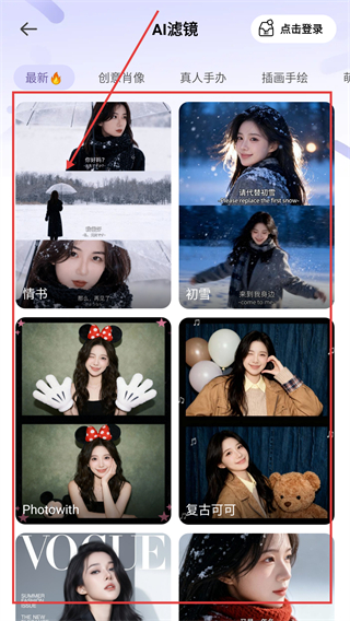 3、还可以切换到【滤镜】页面,可看到多种风格的滤镜模板,像【情书】【初雪】都能给图片换氛围呢。