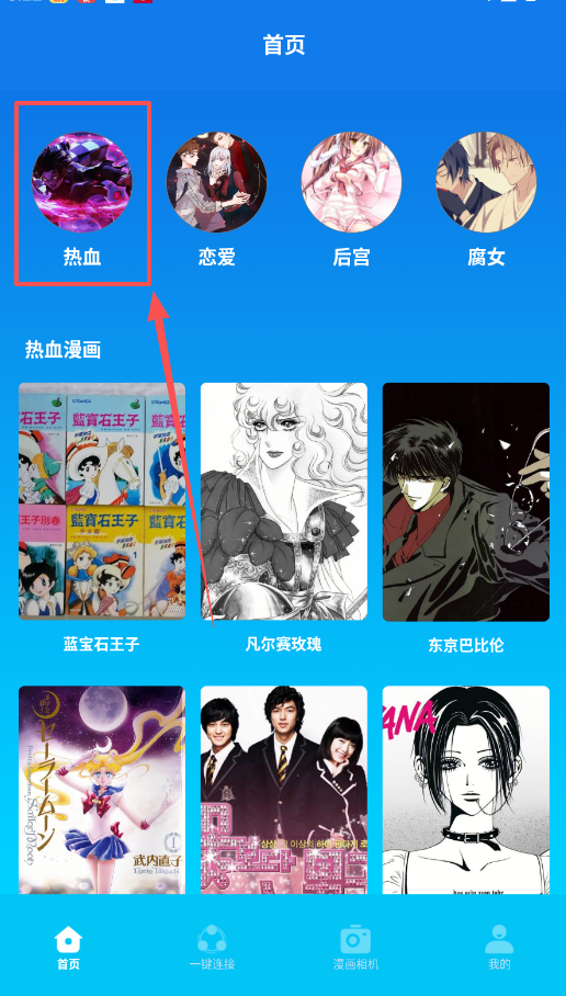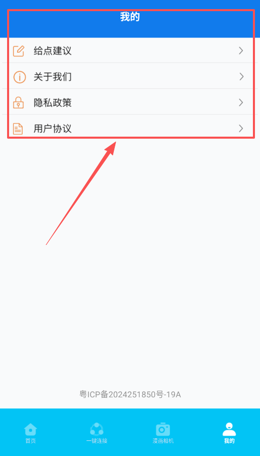 1、初次打开软件,请留意底部的菜单栏,它包含了首页、一键连接、漫画相机和我的四个选项,这是你导航整个应用的基础。
