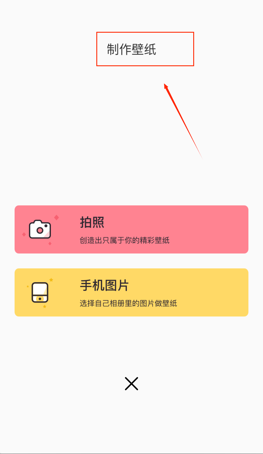 2、想要制作壁纸时点击底部加号按钮,会进入制作界面,这里提供拍照和相册两种选择,粉色拍照按钮可以现场拍摄创作。