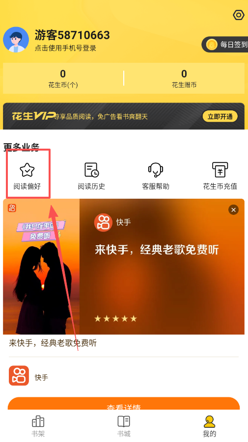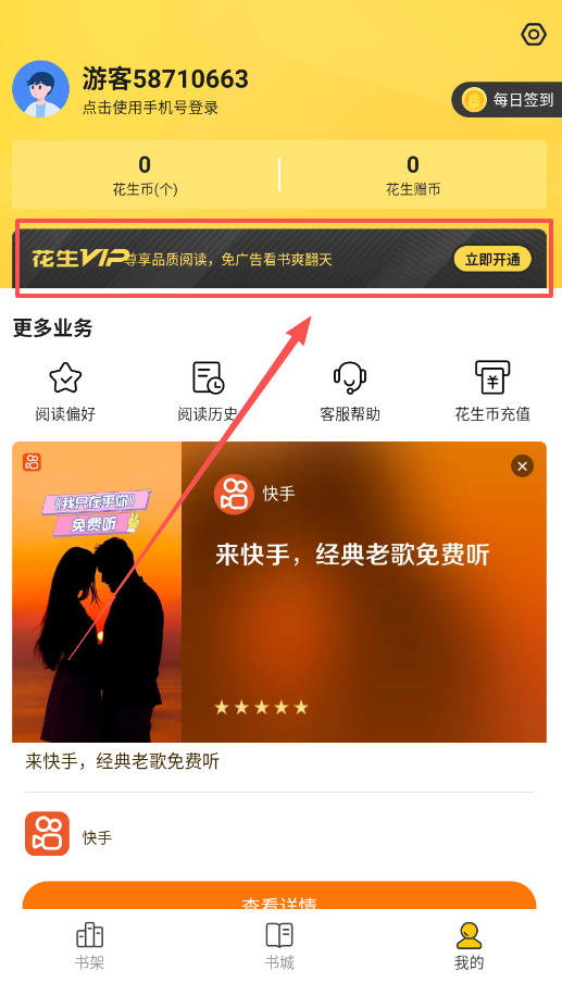 3、想获得更好阅读体验的话,可以在"我的"页面开通花生VIP,享受免广告特权,如果需要购买章节,可以使用花生币。