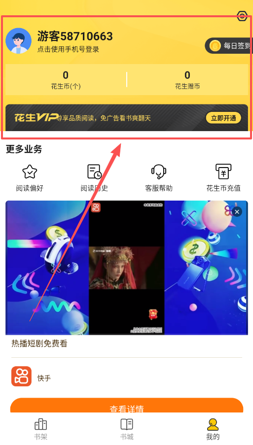 1、首先下载并安装花生小说,通过简单的注册流程,即可进入丰富的小说世界,随时开启您的阅读之旅。