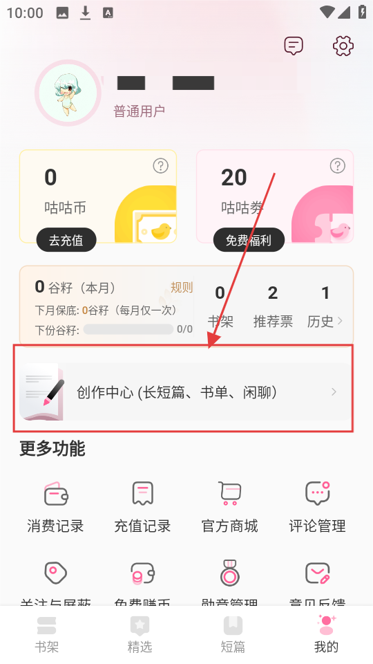 2、在个人页面点击【创作中心(长短篇、书单、闲聊)】,就能进入创作相关页面啦。