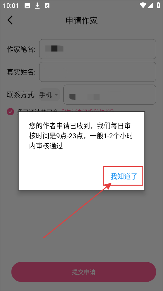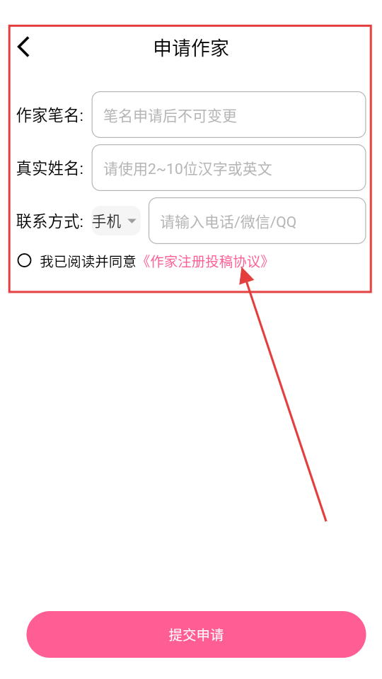 3、在申请作家页面填写笔名、真实姓名、联系方式,勾选同意协议,就能提交申请哦。