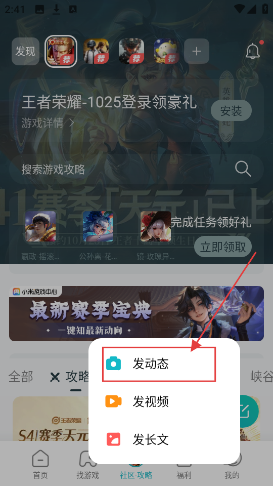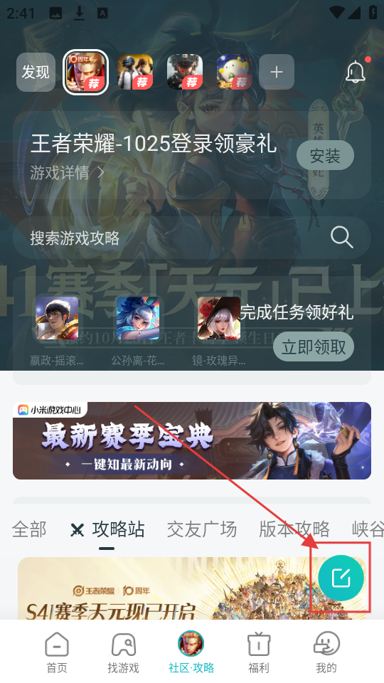 1、在社区攻略页面,看到右下角的圆形图标,点击它就能弹出内容发布选择框,选择要发布的内容类型啦。