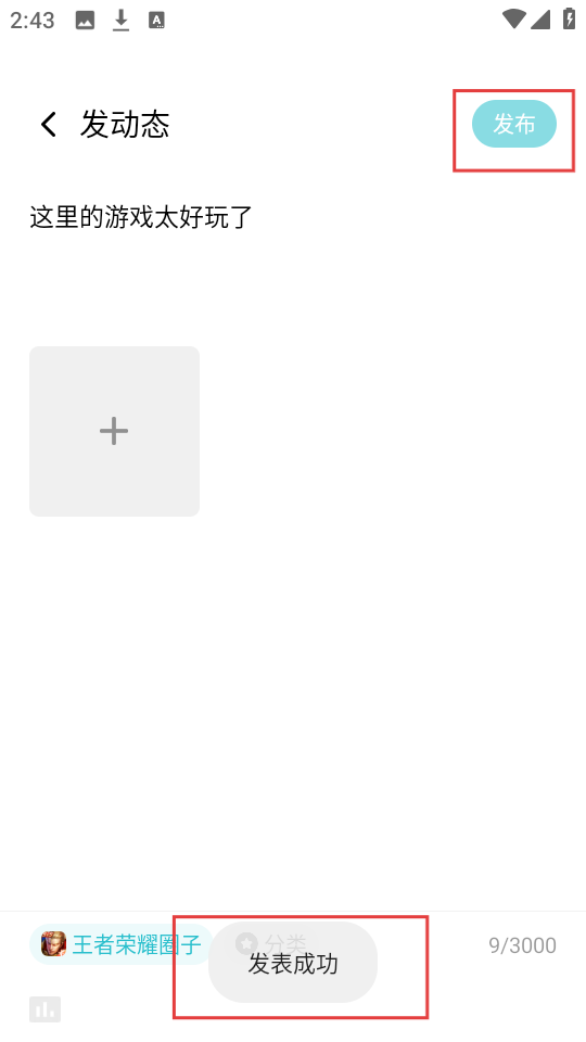 3、在动态发布编辑页面,输入想分享的游戏乐趣,还能点击“+”号添加图片,丰富动态内容啦。