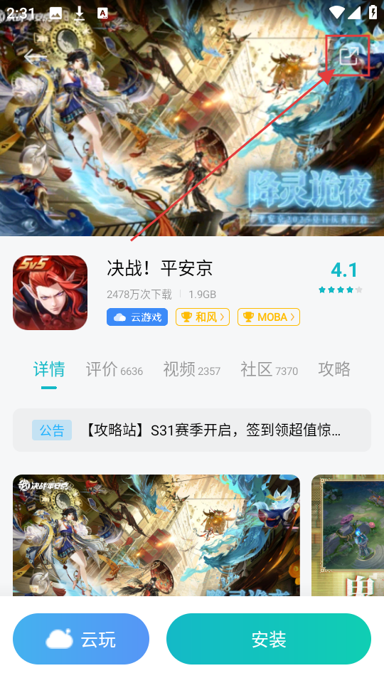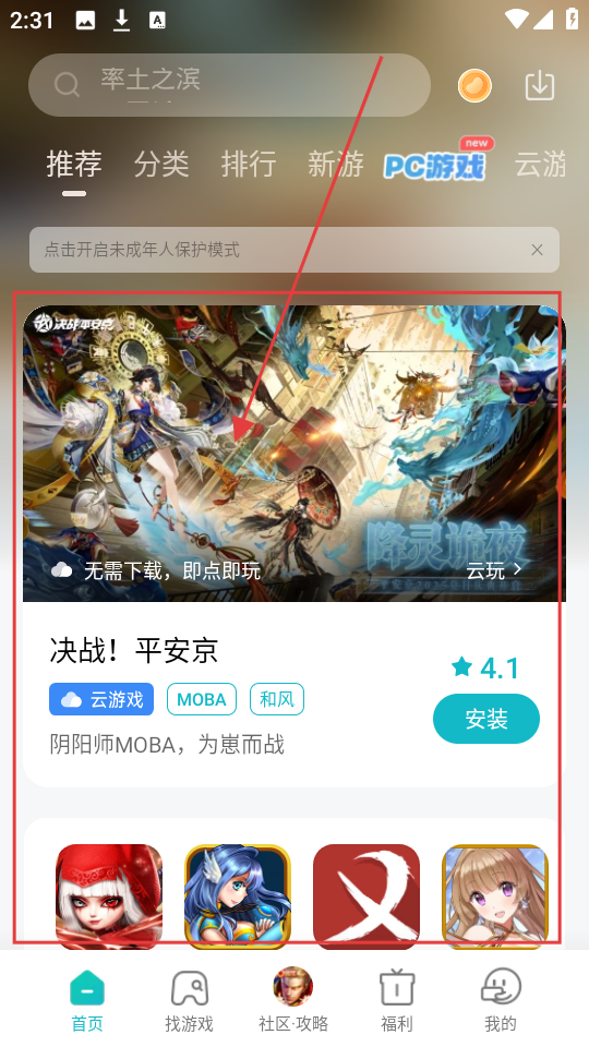 1、在软件首页,看到像【决战!平安京】等推荐游戏,选中心仪游戏,就能进入其详情页面啦。