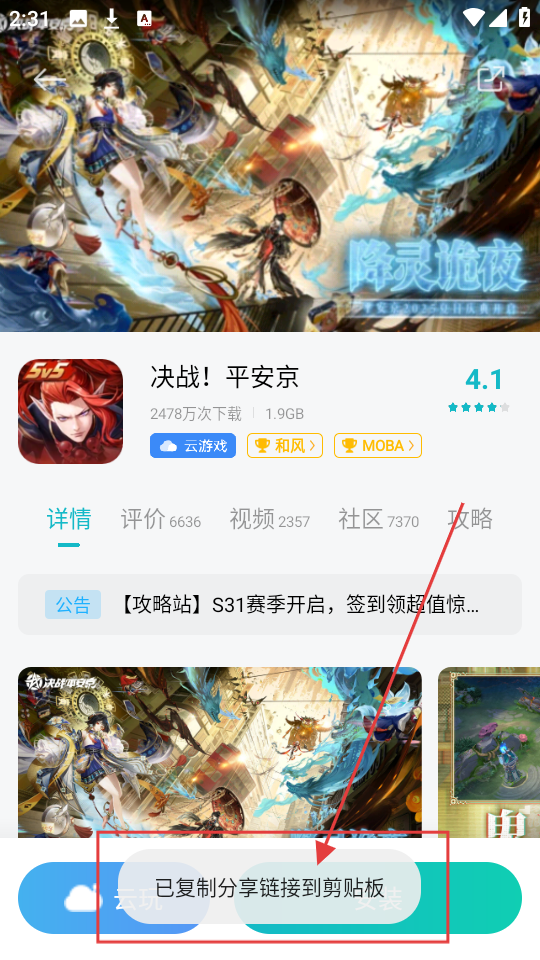2、进入游戏详情页面,点击右上角分享图标,就能弹出分享与反馈选项框,选择分享方式咯。