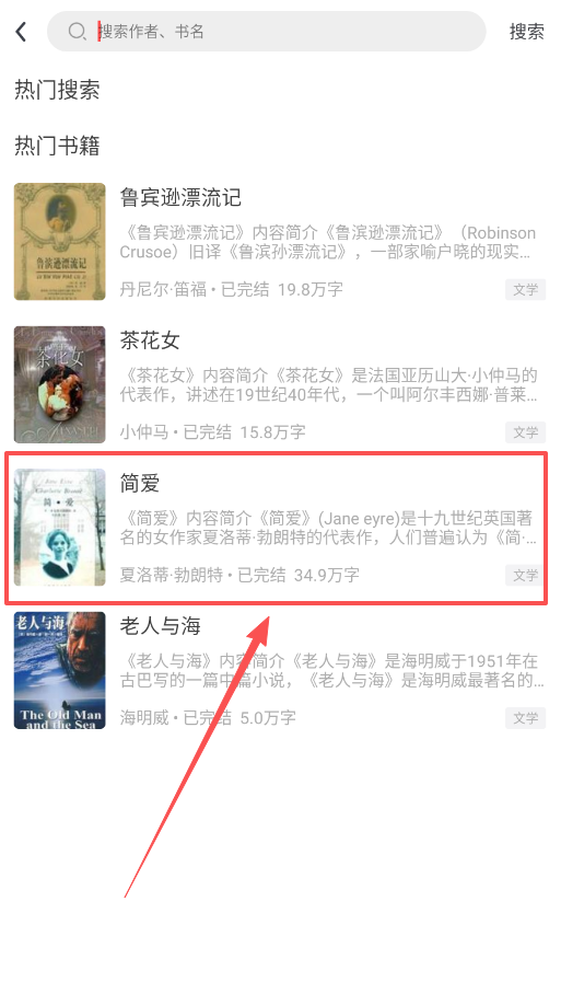 2、热门搜索不仅展示热门书,还提供作者信息和字数统计,比如知道简爱是34.9万字,能预估阅读时间。