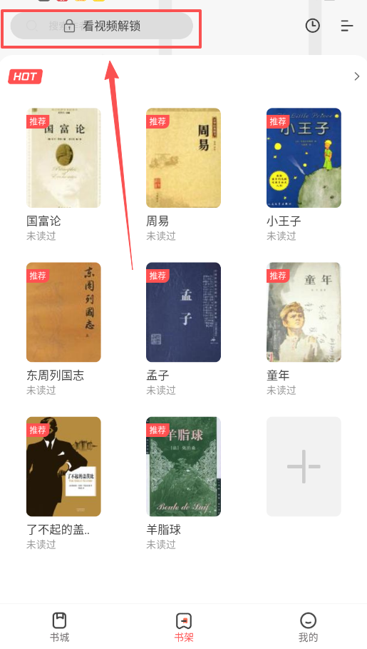 3、解锁区的书单会定期更新,像童年、了不起的盖茨比这些书,通过看视频解锁后就会转到书架里方便随时阅读。