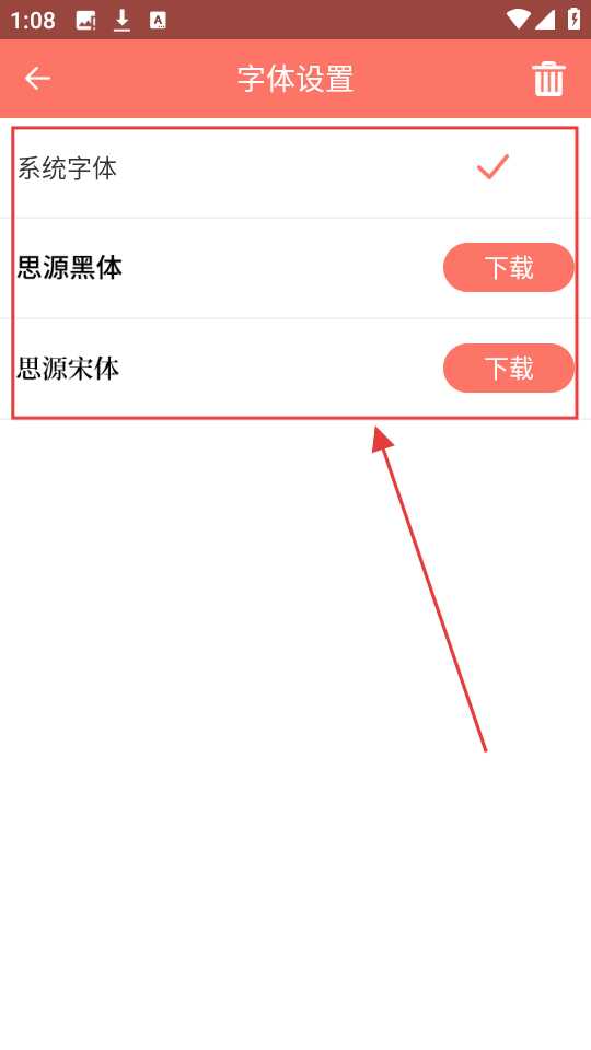4、在字体选择页面,可选择系统字体、思源黑体、思源宋体等,还可下载新字体,打造舒适阅读体验哦。