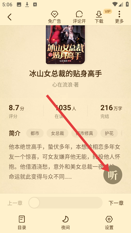 1、在小说阅读页,若不想看文字想听讲书,点击页面右侧的【听】按钮,就能进入听书模式啦。