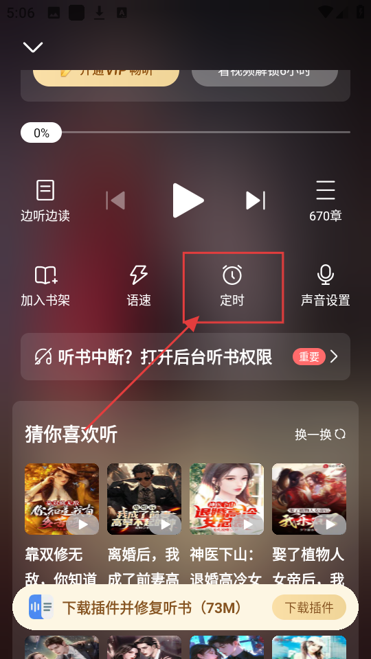2、进入听书模式后,看到【定时】按钮,点击它可设置听书的定时关闭时间,很实用的哟。