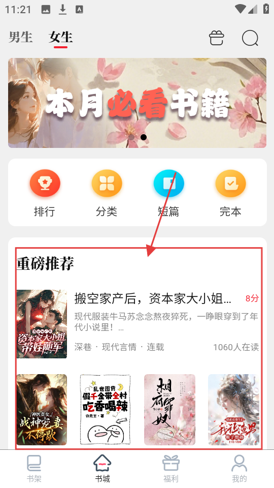 1、在书城【女生】分类里,【重磅推荐】的小说超值得看,快去挑选心仪的吧。