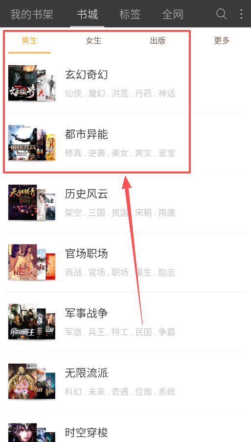 1、首先看底部导航栏,核心是“书城”找书和“我的书架”管书。在书城,先选男生或女生频道,再挑玄幻、都市等具体分类。