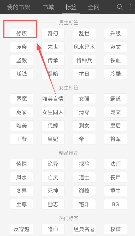 2、进阶找书可用“标签”功能,里面有修炼、末世、女强、重生等上百个精细标签,点一下就能筛出同类作品,比翻分类更快更准。