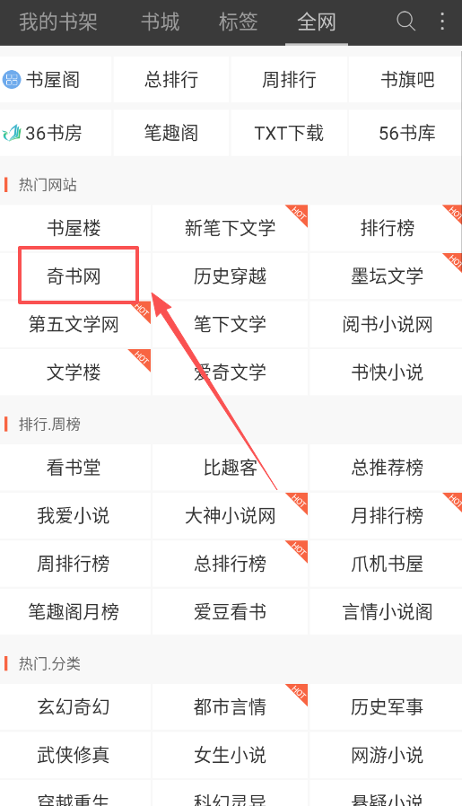 3、“全网”页面像个资源大全,集合了笔趣阁、奇书网等热门书站,还有各种排行榜。可以这里跳转外站,或看榜单了解流行趋势。
