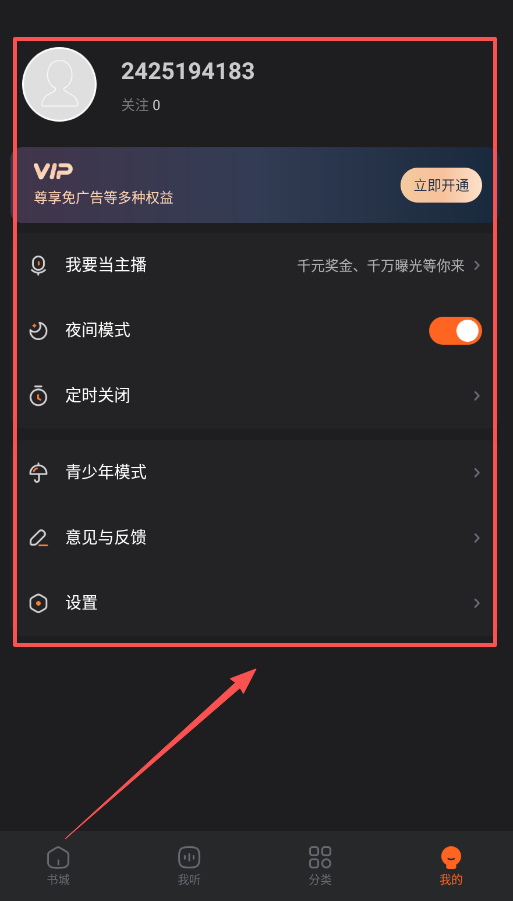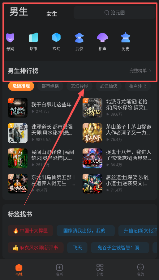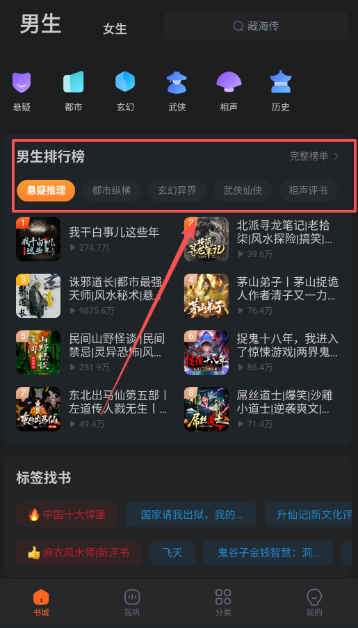 1、打开软件后,先看底部导航栏,重点使用“书城”和“分类”这两个入口,能帮你快速了解有什么可听的。